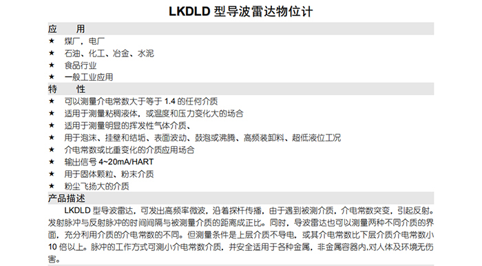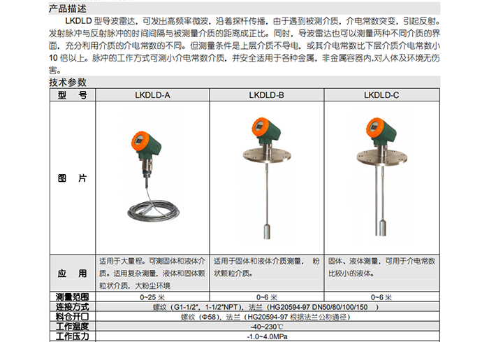 您現在的位置:首頁  > 產品展示  > LKDLD型導波雷達物位計(料位、液位)